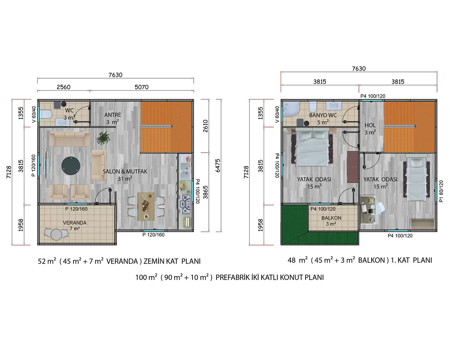 100 m² prefabrik ev, çelik konstrüksiyon taşıyıcılı, yalıtımlı dış duvarlı, mutfak dolabı, zemin kaplamaları, elektrik ve su tesisatı dâhil anahtar teslim sunulan, aile yaşamına uygun konforlu ve ekonomik bir hazır konut modelidir.