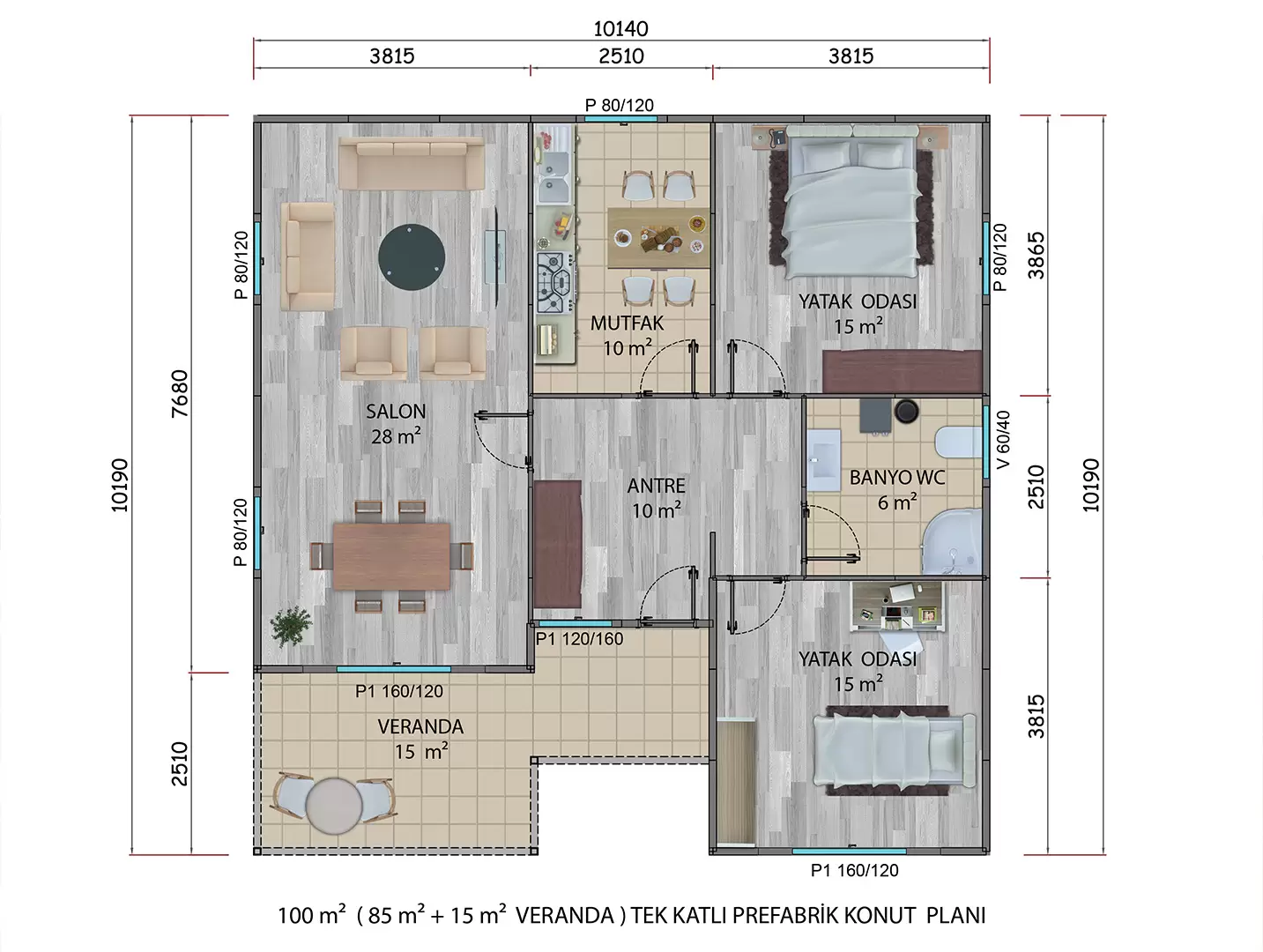 • Brüt Alan: 100 m² (ör. 8.3 × 12.0 m / 7.7 × 13.0 m; yerleşime göre değişir)