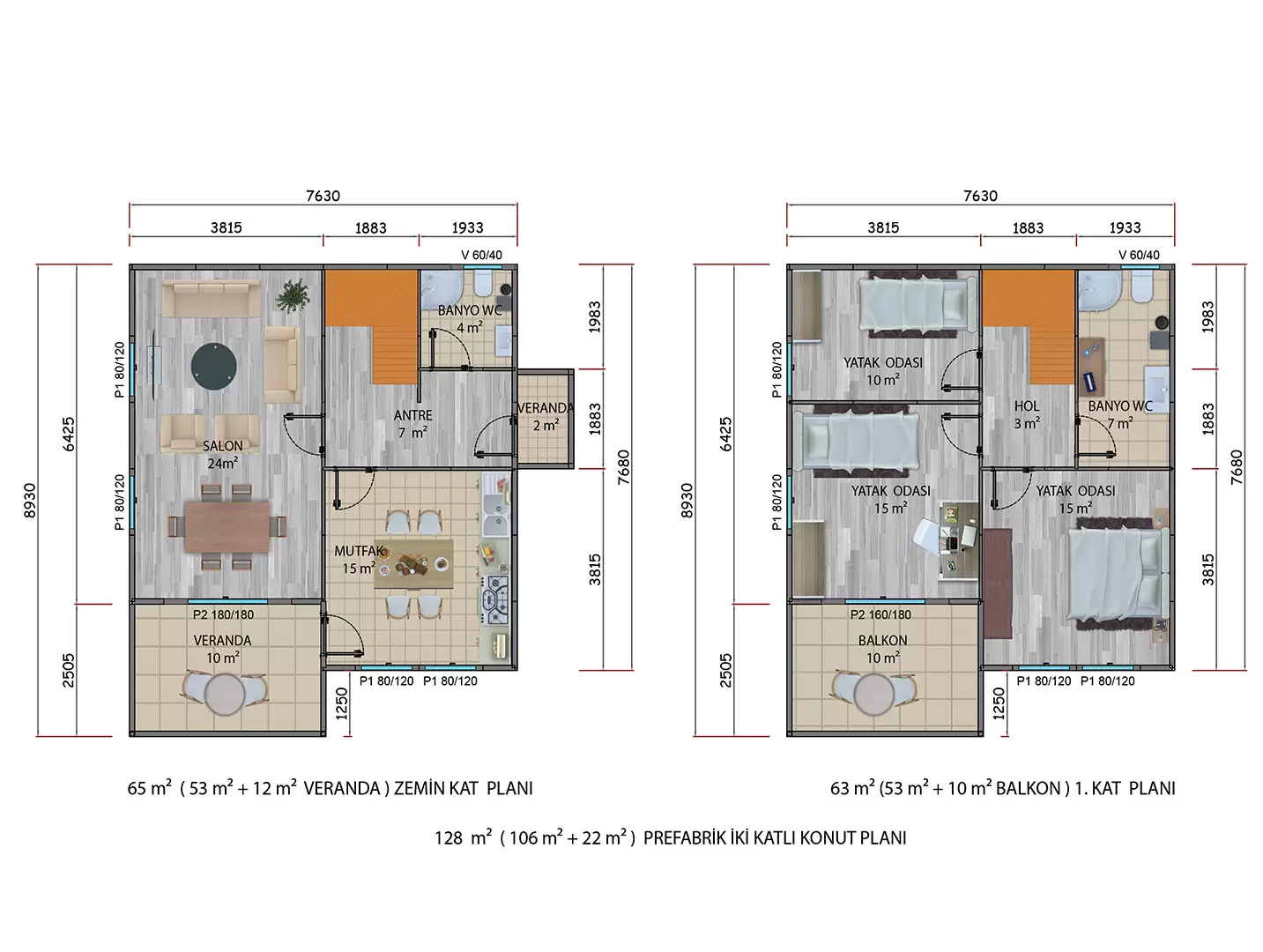 128 m² Çift Katlı Prefabrik Ev Planı ve İç Yerleşim Düzeni