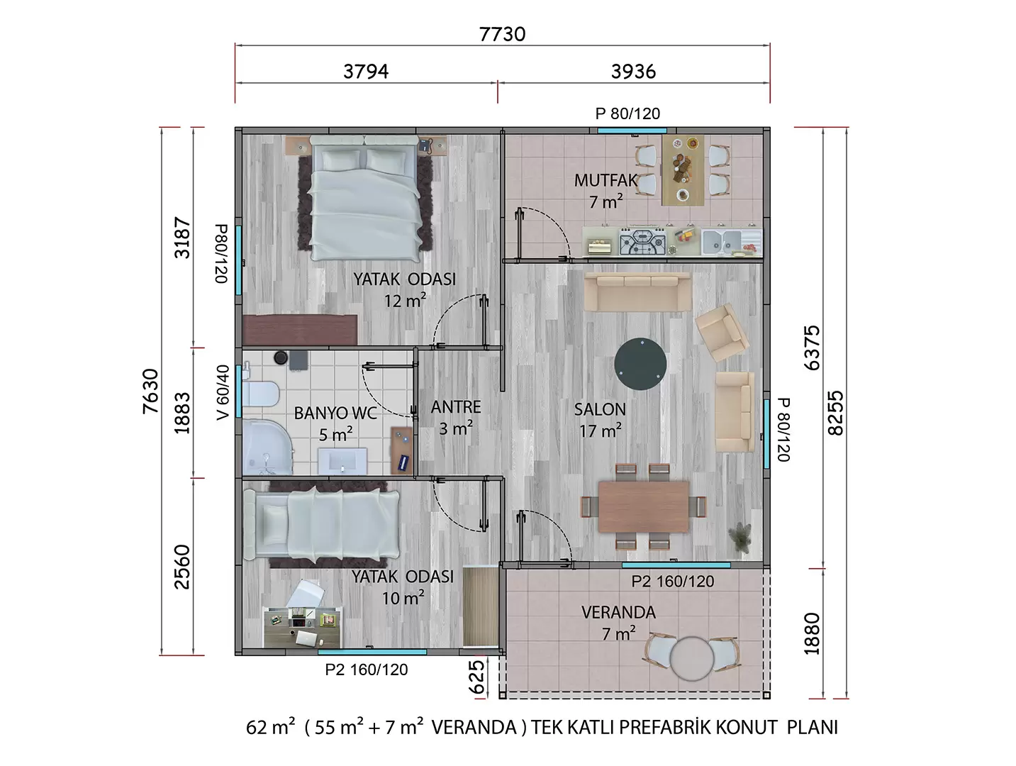 Tipik brüt oturum alanı 62 m² olan bir prefabrik tek katlı ev, en yaygın olarak 2+1 planlanır: