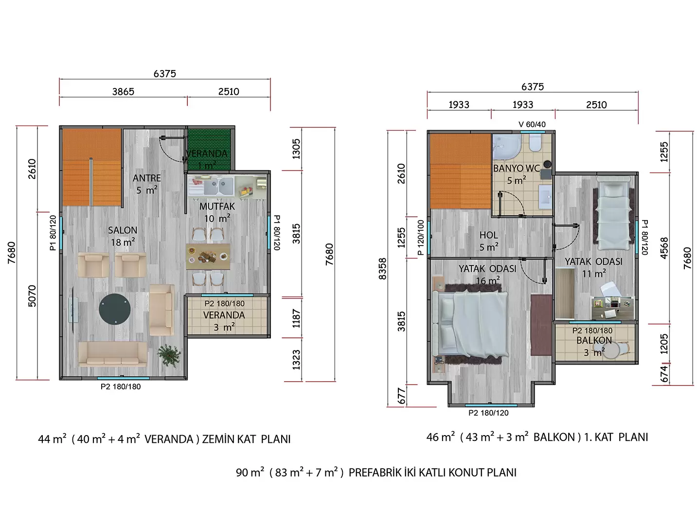 Dayanıklı çelik konstrüksiyon yapısı, güçlü yalıtımı, kısa montaj süresi ve estetik tasarımı ile 90 m² çift katlı prefabrik ev; hem bugünün hem de geleceğin konforlu yaşam anlayışına cevap veren modern bir konut çözümüdür.